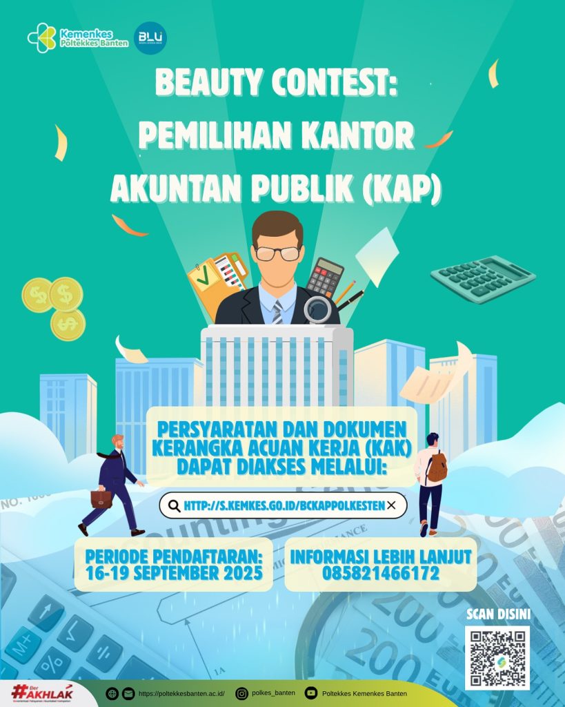 Sehubungan dengan surat Direktorat Jenderal Sumber Daya Manusia Kesehatan Kementerian Kesehatan Nomor KU.04.05/F.I/11193/2025 tanggal 12 September 2025 tentang Penunjukkan Kantor Akuntan Publik atas Laporan Keuangan Tahun Pelaporan, maka Politeknik Kesehatan Banten akan melaksanakan proses seleksi (Beauty Contest) Pemilihan Kantor Akuntan Publik (KAP) yang akan melakukan audit eksternal atas Laporan Keuangan BLU Tahun Anggaran 2025. Beauty …