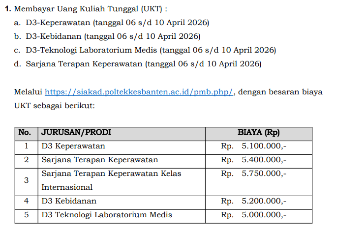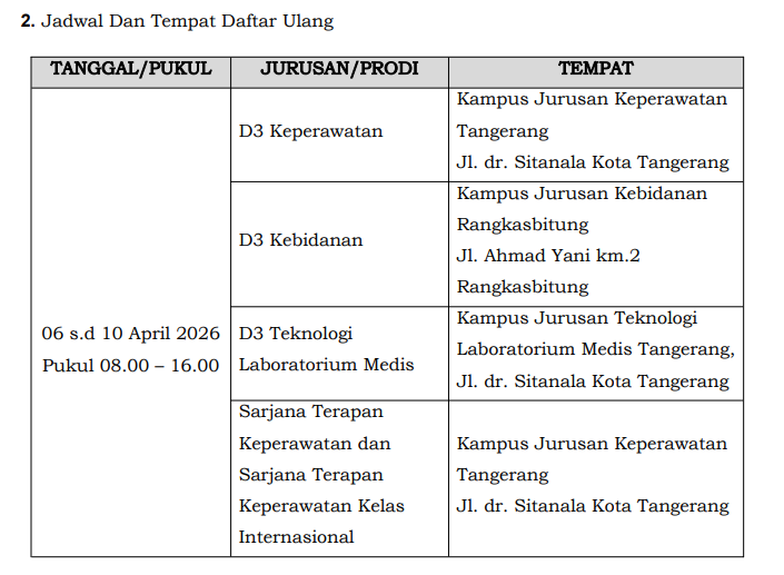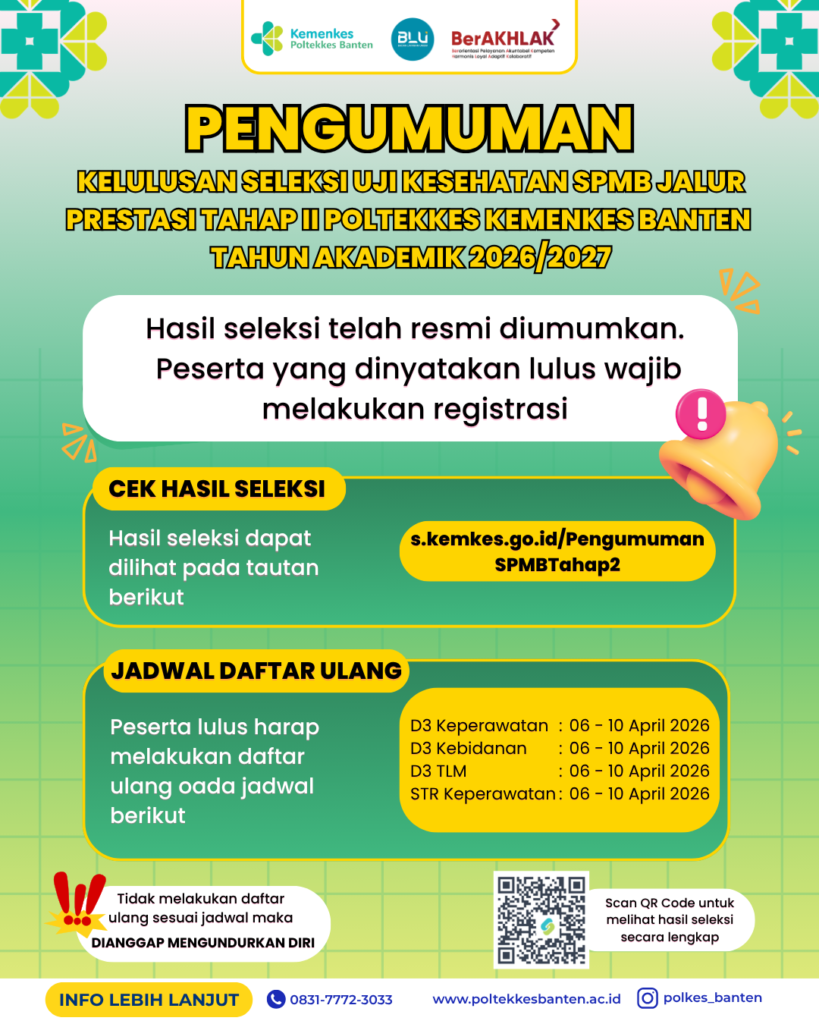 Bagi calon mahasiswa Poltekkes Kemenkes Banten yang dinyatakan LULUS UJI KESEHATAN Jalur SIMAMA (Tahap II) Tahun Akademik 2026/2027, selanjutnya diwajibkan Registrasi (Daftar Ulang) sebagai berikut :