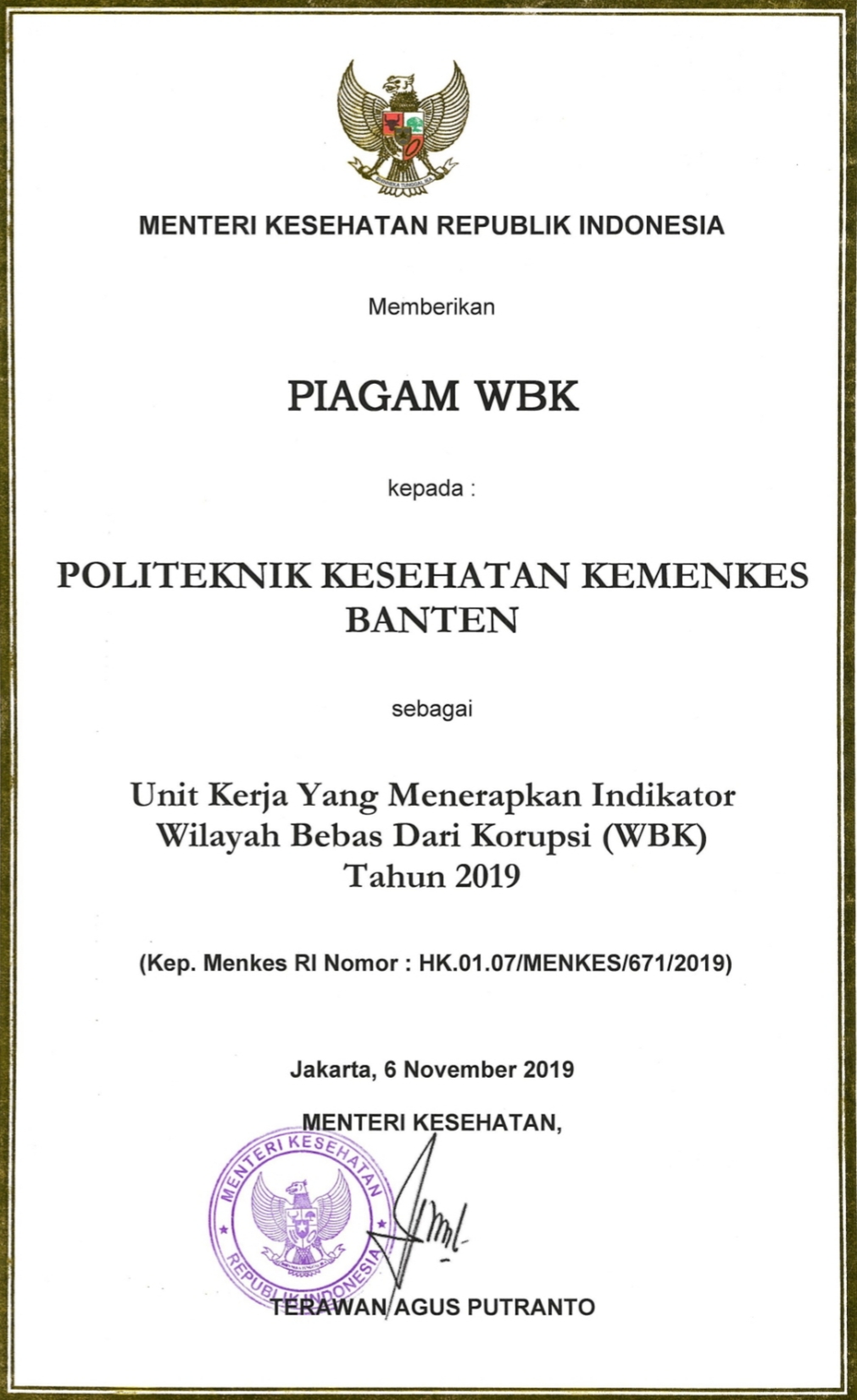Penyerahan Piagam Wilayah Bebas dari Korupsi (WBK). Ddiberikan oleh Menteri Kesehatan dr Terawan Agus Putranto Kepada Direktur Poltekkes Kemenkes Banten Hj. Een Sukedah, SKM, M.Kes Pada Acara Hari Kesehatan Nasional tanggal 12 November 2019 di Kantor Pusat Kementerian Kesehatan Republik Indonesia, Jl. HR. Rasuna Said nomor 4-9, Jakarta Selatan.